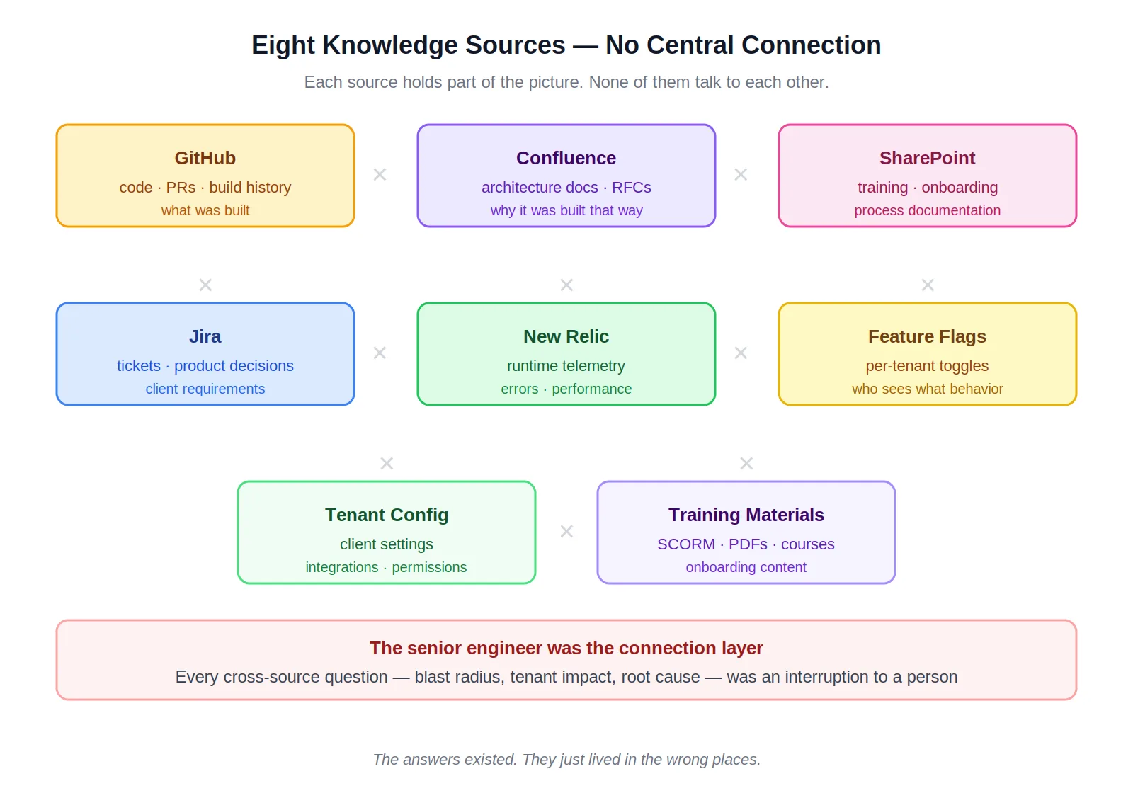Confluence held the architecture decisions. GitHub held the implementation history. SharePoint held training materials. Jira held the product reasoning and client-specific decisions. New Relic held the runtime behavior. Feature flag definitions and tenant configuration were scattered across systems that only senior engineers fully understood.