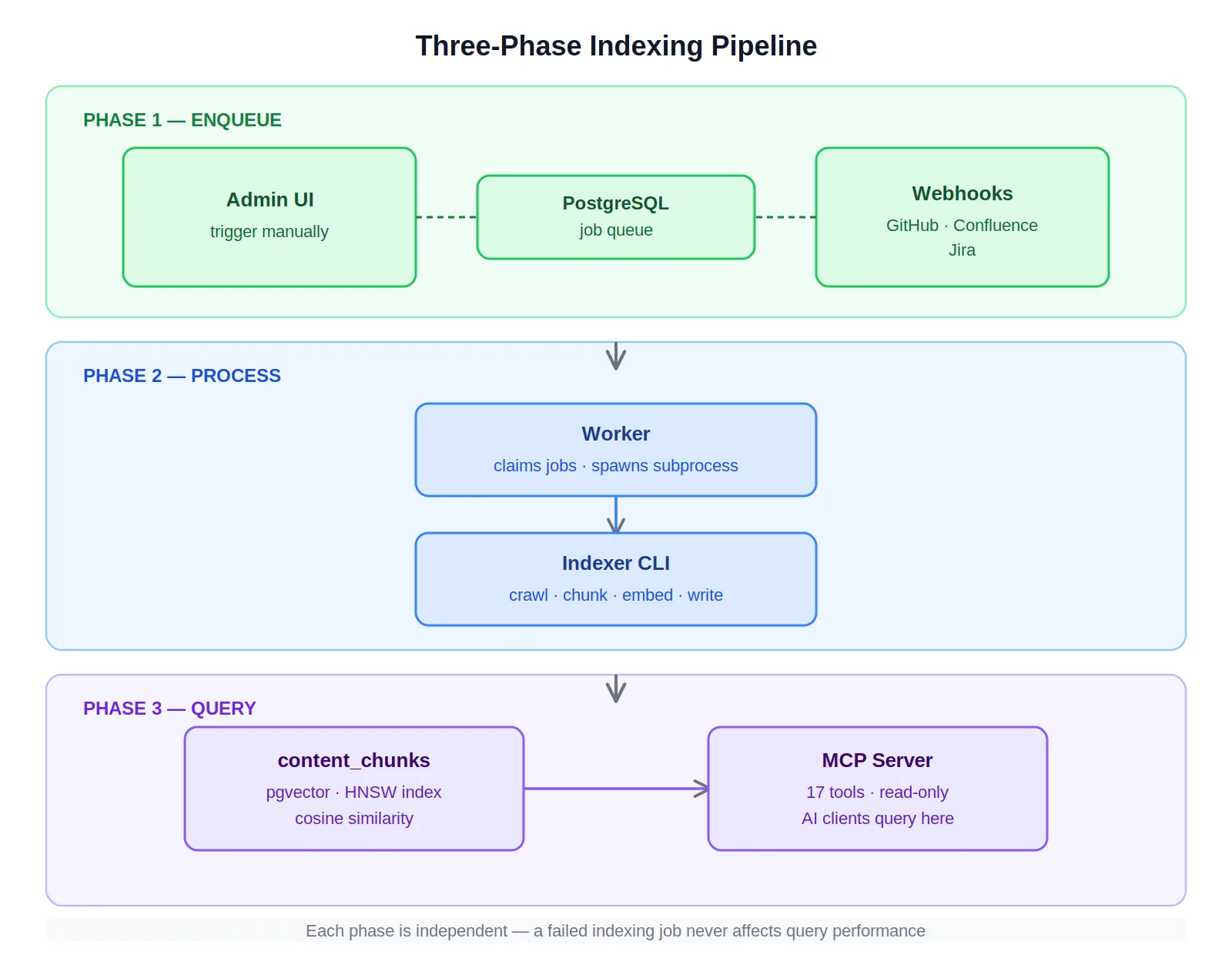 Phase 3 — Querying. The MCP Server is read-only. It exposes semantic search, source-specific retrieval, schema lookup, and tenant configuration queries as tools that AI clients reason with — not an API they call. A slow query doesn't affect the indexing pipeline. An indexing run doesn't degrade query performance. The phases share a PostgreSQL database and nothing else.