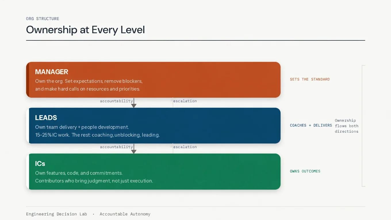 The premise is simple. We hire talented, well-compensated engineers because they are capable of owning outcomes. My job isn't to tell them how to do their work — it's to make sure they know what success looks like, have what they need to get there, and are held to that standard.
