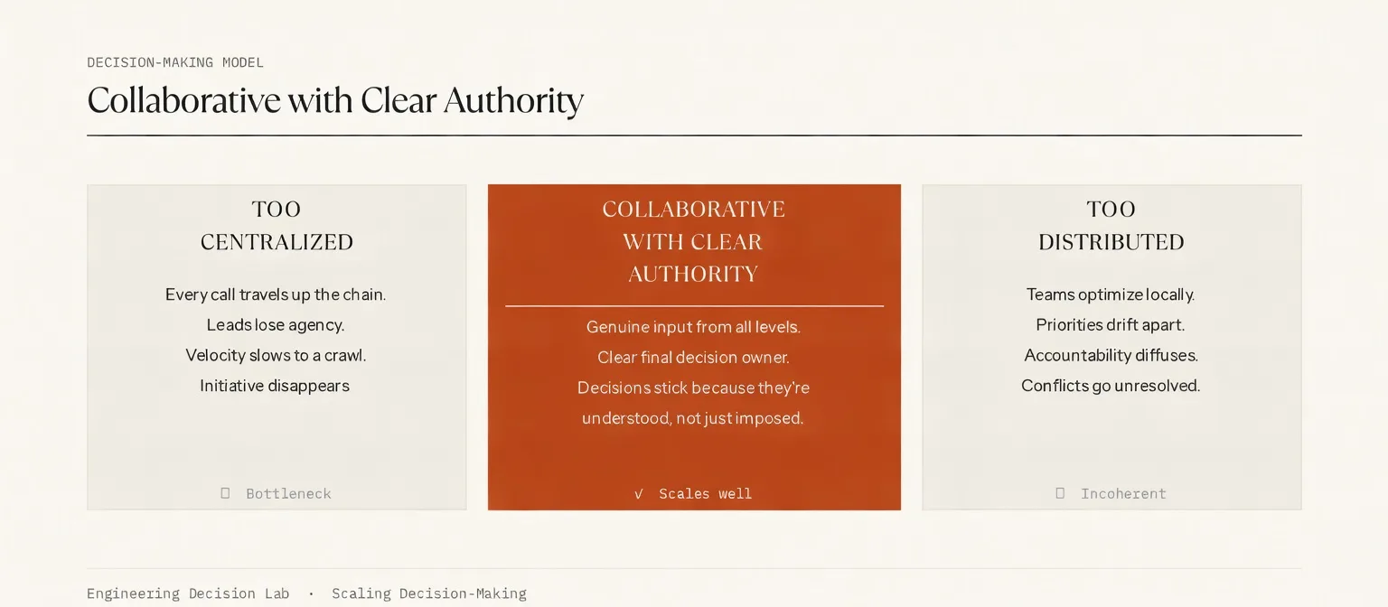 As engineering organizations grow, decision-making becomes one of the hardest things to scale. Too centralized and you become a bottleneck. Too distributed and you lose coherence. The answer is a model where collaboration is genuine, authority is clear, and the reasoning behind hard calls is transparent enough that people can commit even when they disagree.